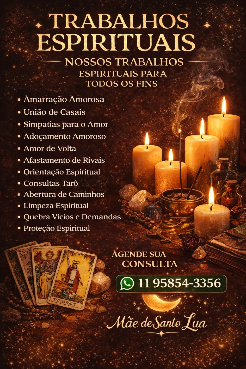 Chamar no WhatsApp →Amor, proteção, limpeza espiritual e abertura de caminhos — cada caso é analisado em consulta para indicar o melhor direcionamento.